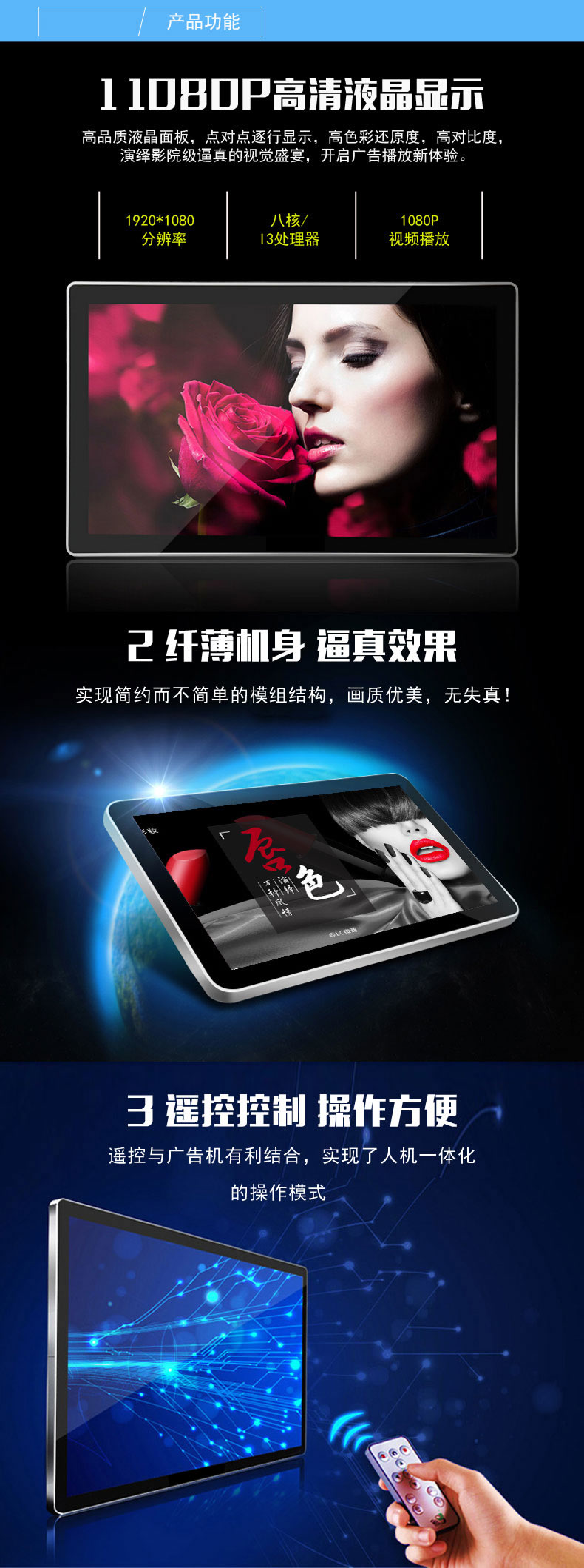 Support menu rotation, OSD multi language display, automatic loop playback upon startup, breakpoint memory, ad insertion, timed power on/off, time-division volume, logo, flowing subtitles, USB program update, automatic generation of playback logs, support for videos, images, image music, and mixed mode. |